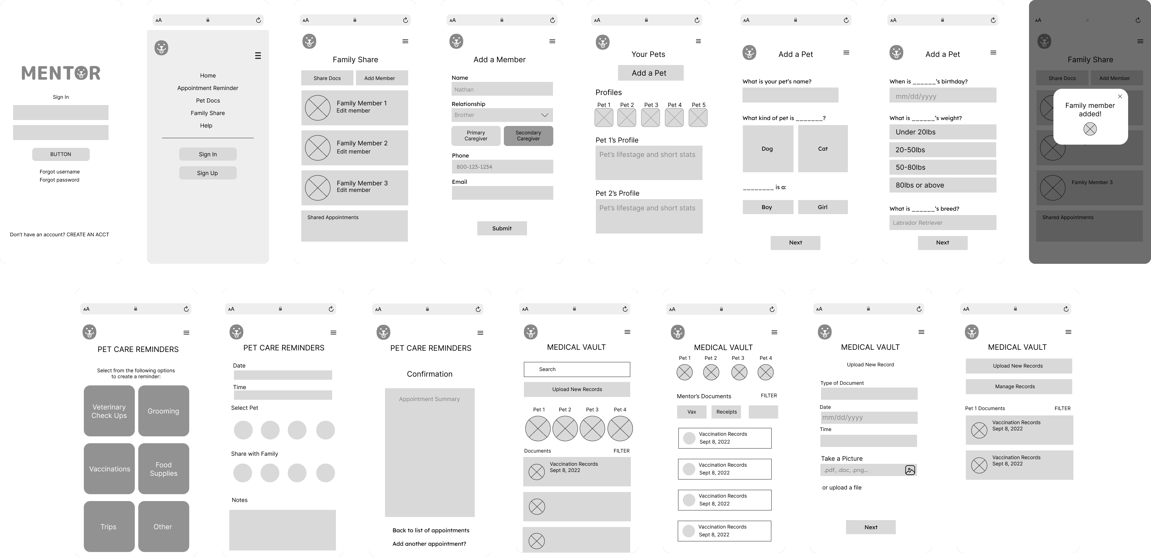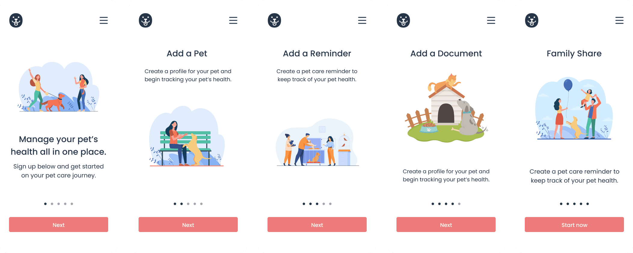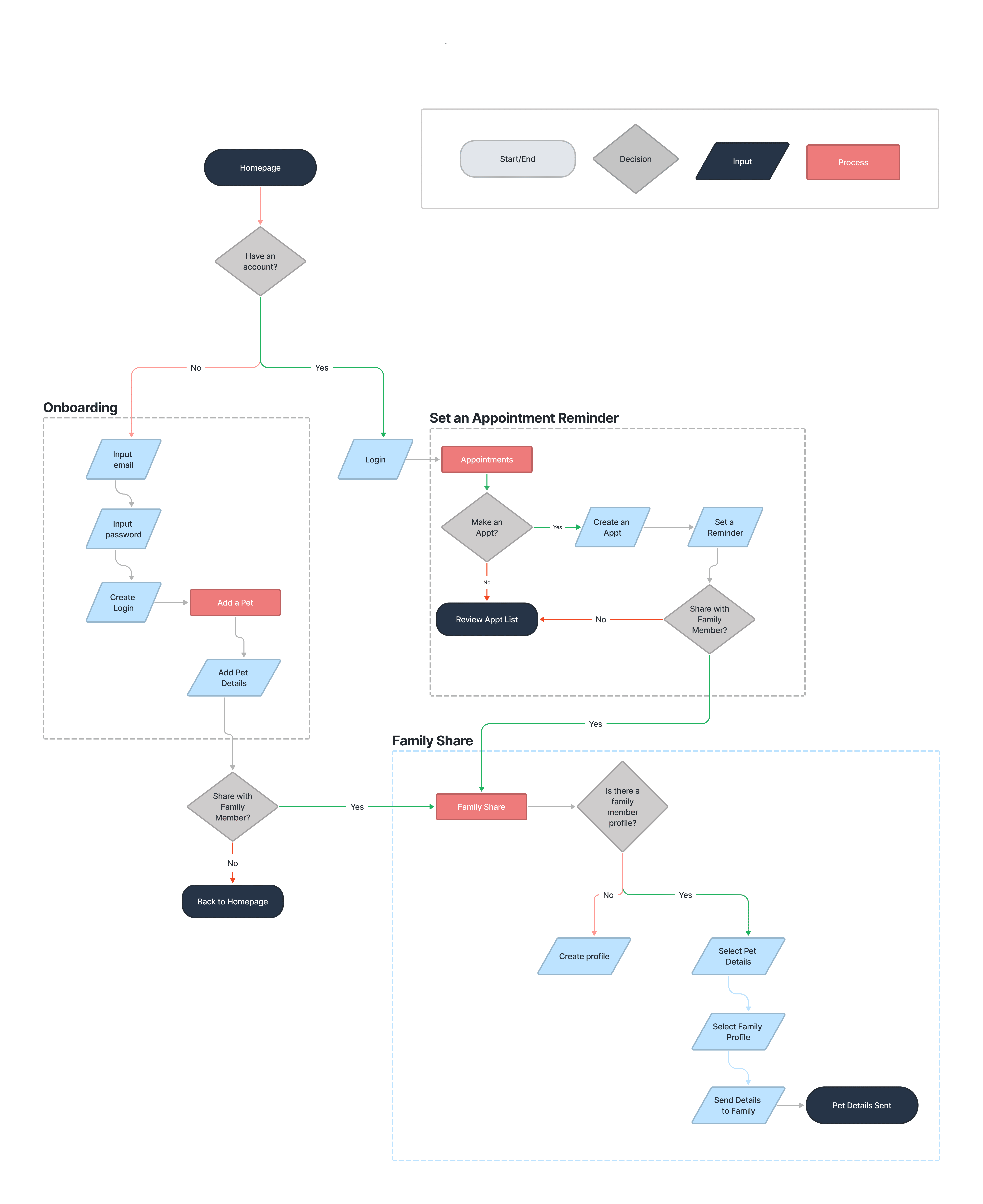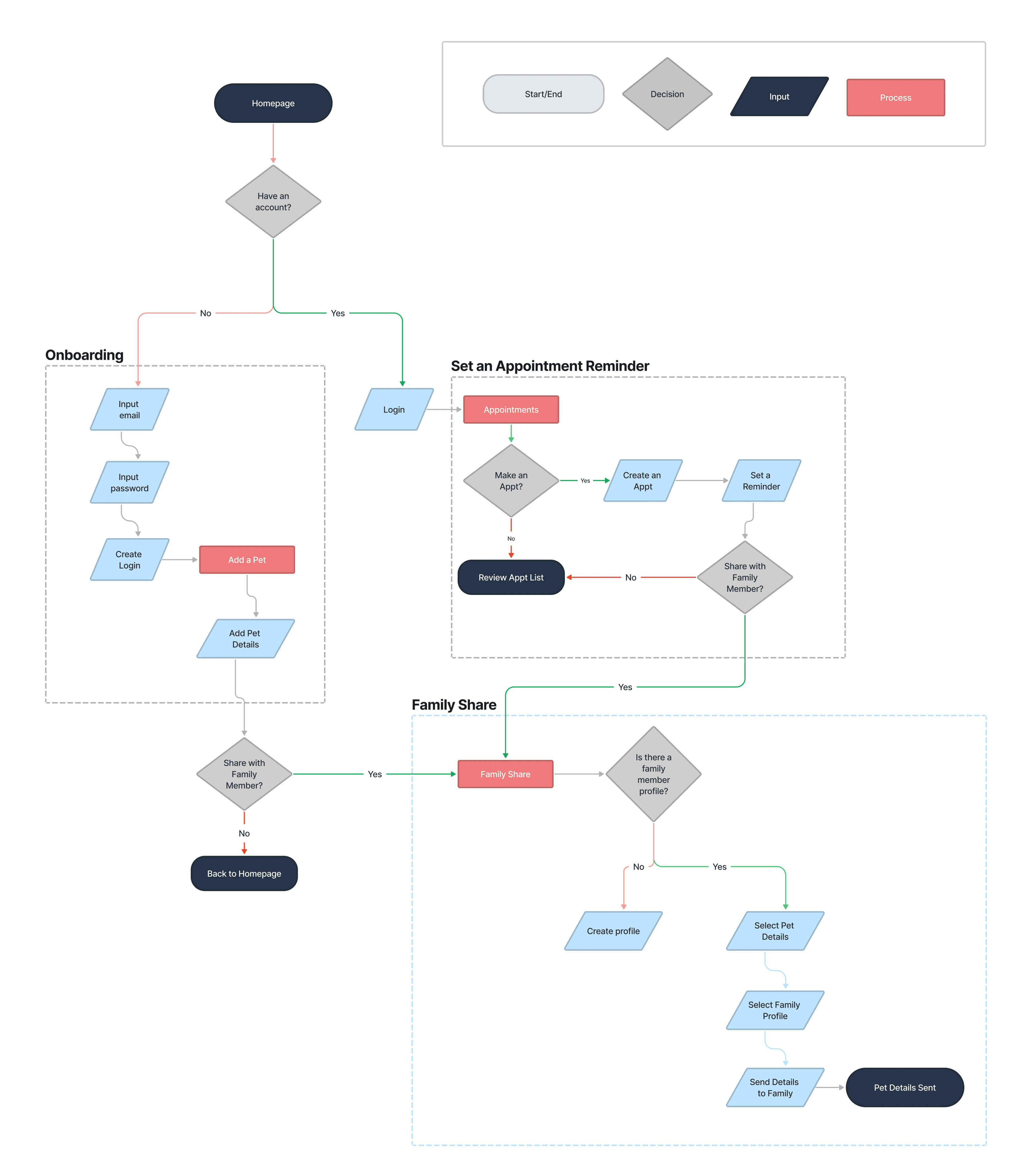Competitive analysis revealed significant features for pet care apps, including personal accounts, appointment reminders, and family share capabilities.