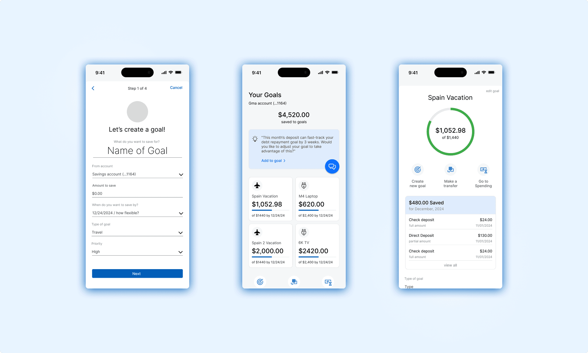 Key features were designed to highlight the AI’s ability to dynamically adjust goals, provide real-time insights, and offer personalized recommendations for smarter financial management. My design strategy focused on three core principles below:
