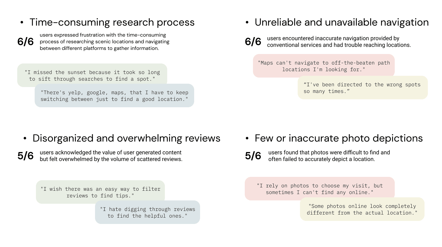 I conducted 6 interviews with users that have researched and visited at least 1 new scenic location within 12 months, revealing 4 major components of improvements.