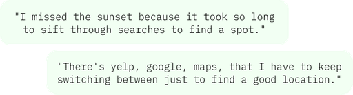 Initially I hypothesized that users' primary concern was the need for organization. However, further research proved this to be secondary, as users were able to work around these limitations despite its frustrations. What was really missing was a way for users to share their suggestions and ideas in a centralized location and collaborate on travel decisions.